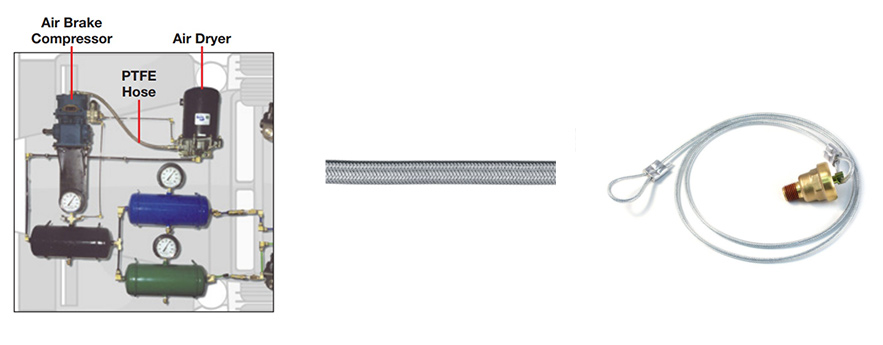 সংক্ষেপক সিস্টেমে তিনটি উপাদান রয়েছে: সংক্ষেপক, এয়ার ড্রায়ার এবং সংযোগকারী পায়ের পাতার মোজাবিশেষ বা নল। সংক্ষেপক দ্বারা উত্পাদিত বায়ু প্রবাহ এটি শর্তযুক্ত না হওয়া পর্যন্ত ব্যবহার করা যাবে না। কাঁচা সংকুচিত বাতাসে দুটি সমস্যা রয়েছে। প্রথমত, সংক্ষেপক থেকে আসা বায়ু স্ট্যান্ডার্ড টিউবিংয়ের জন্য খুব গরম। পিটিএফই পায়ের পাতার মোজাবিশেষটি ড্রায়ারের সাথে সংক্ষেপককে সংযুক্ত করতে ব্যবহৃত হয় কারণ এটি তাপমাত্রা 400 ° F অবধি পরিচালনা করতে পারে। পিটিএফই পায়ের পাতার মোজাবিশেষ স্টেইনলেস স্টিল ব্রেড দ্বারা চিহ্নিত করা যেতে পারে যা কভার এবং শক্তিবৃদ্ধি উভয়ই হিসাবে কাজ করে।